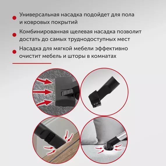 | Комплектация | насадка для мягкой мебели, насадка для пола и ковров, щелевая насадка, щетка |