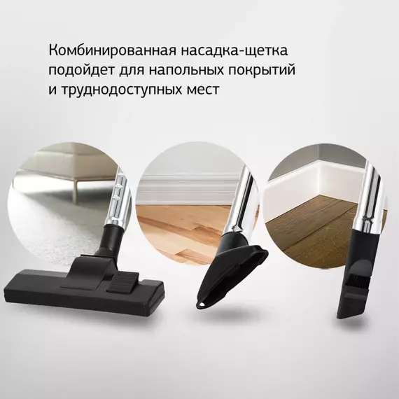 | Комплектация | насадка для влажной уборки ковров/полов, насадка для мягкой мебели, насадка для пола и ковров, щелевая насадка, щетка |