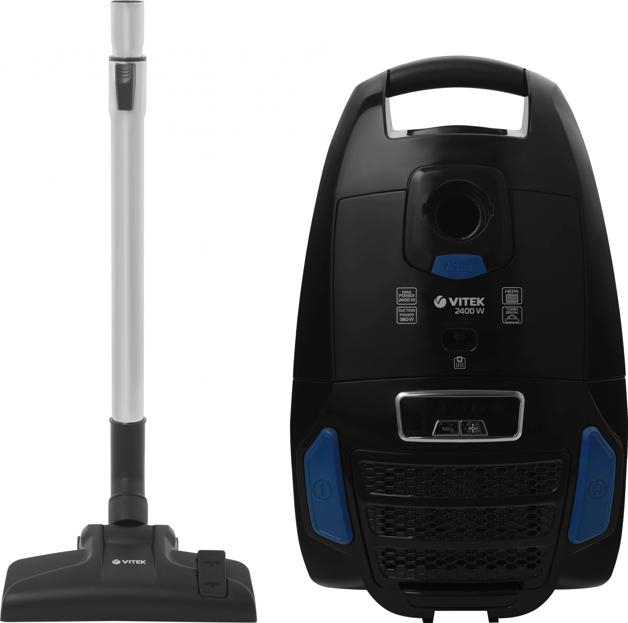 Пылесос Vitek VT-1899 с сухой уборкой, мощностью всасывания 400 Вт. Объем мешка для сбора пыли составляет 4 литра.