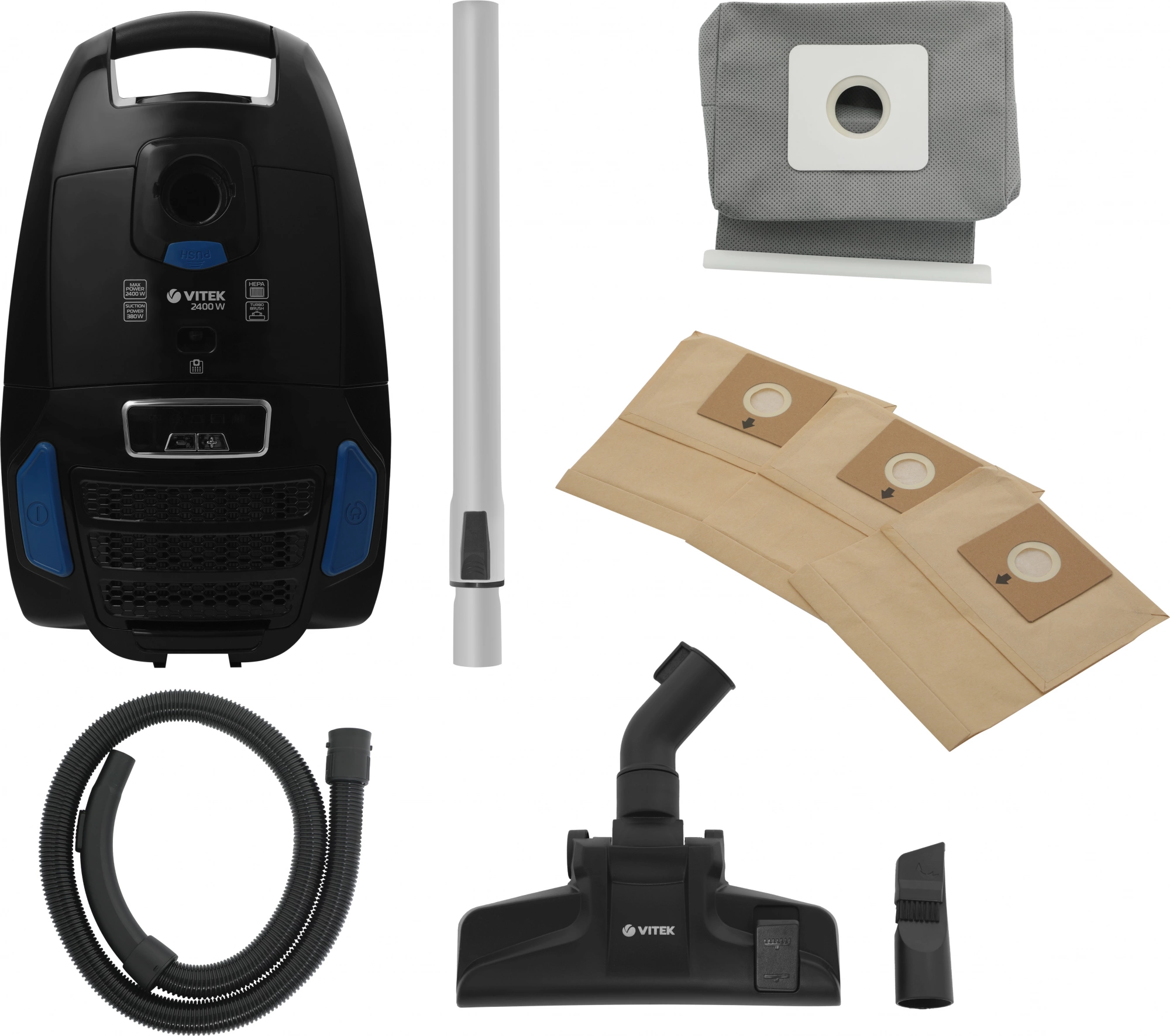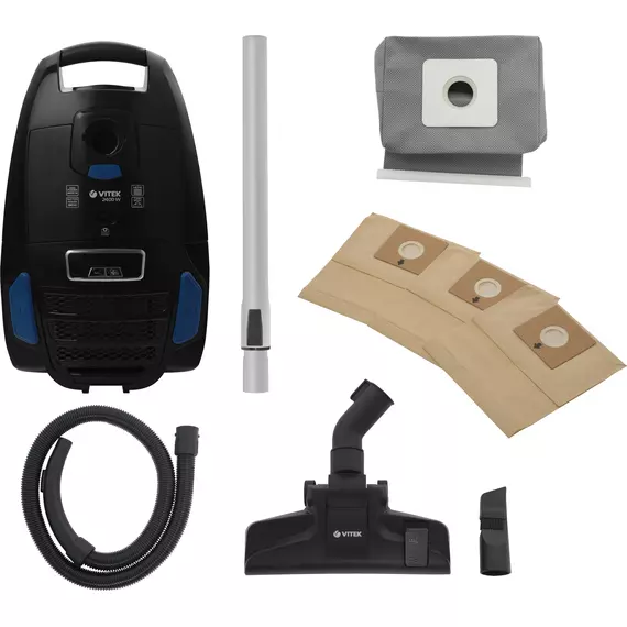 Пылесос, документация, насадка для мебели, щелевая насадка, щетка для уборки пыли, тканевый пылесборник, бумажный пылесборник x 3 шт, упаковка.