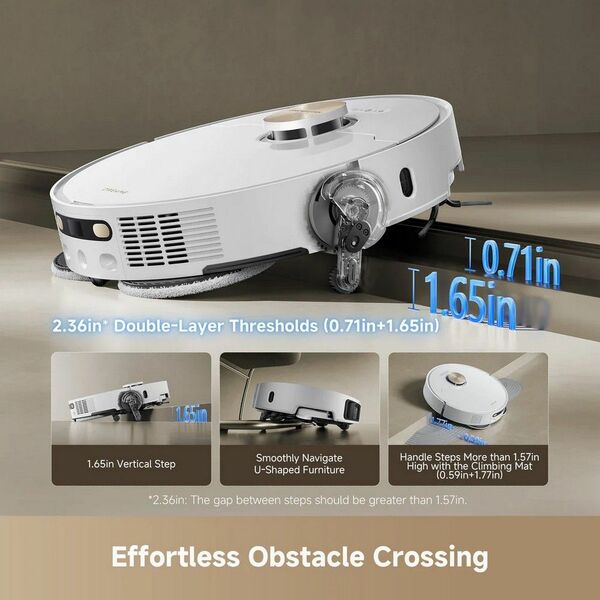 Комплект поставки | Робот-пылесос, базовая станция, боковая щетка, основная щетка, пластина для увеличения рампы базовой станции, салфетка для швабры - 2 шт (предварительно установленная), документация, держатель салфеток для швабры - 2 шт, мешок для мусора - 2 шт (предварительно установленный — 1 шт), ингибитор образования накипи, фильтр-пылесборник, чистящее средство |