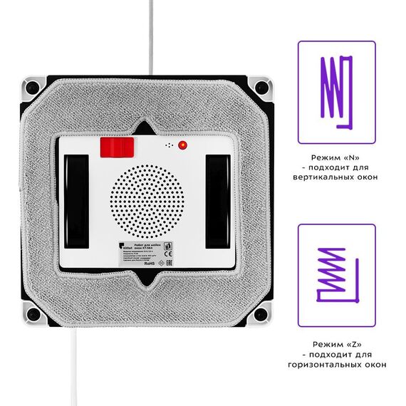 | Особенности | Управляйте роботом на расстоянии до 15 метров с пульта дистанционного управления, а также со смартфона при помощи мобильного приложения RoboKit. Робот имеет 4 режима работы: «N», «Z», очистка левой и очистка правой части окна. Также есть режим очистки колёс. |