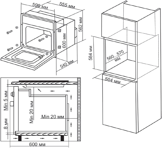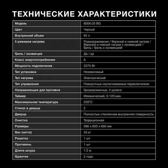 | Режимы духовки | подсветка, верхний и нижний нагрев, верхний и нижний нагрев + конвекция, гриль, гриль + конвекция, разморозка |