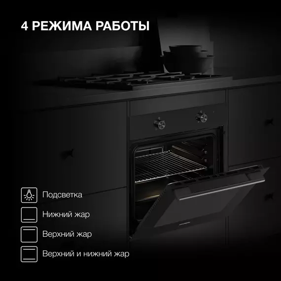 | Режимы духовки | нижний нагрев, верхний нагрев, верх + ниж нагрев, подсветка |