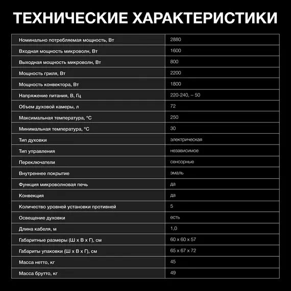 | Режимы духовки | Программа разморозки, Радиаторный гриль, Двойной гриль, Двойной гриль + вентилятор, Нижний нагрев/выпечка, Обычный + Вентилятор, Конвекция, Пицца, Быстрый предварительный нагрев, ЭКО, Ферментация, СВЧ, СВЧ + конвекция, СВЧ + двойной гриль+ вентилятор, СВЧ+пицца |