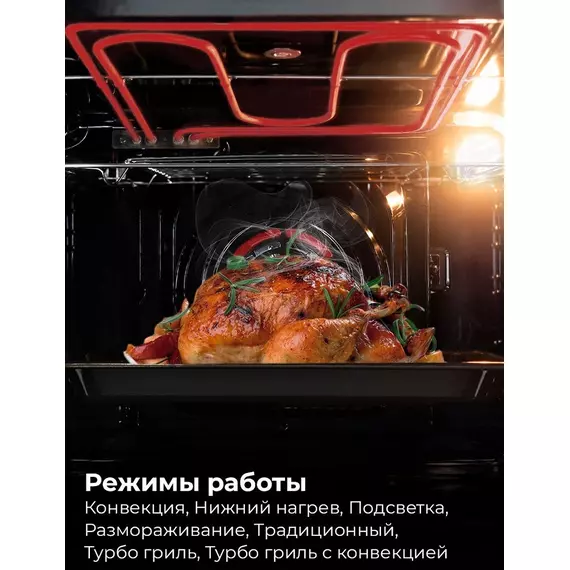 | Режимы духовки | Верхний и нижний нагрев, Верхний и нижний нагрев с конвекцией, Размораживание, Традиционный, Турбо гриль, Турбо гриль с конвекцией |