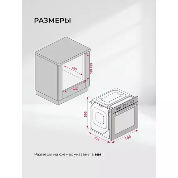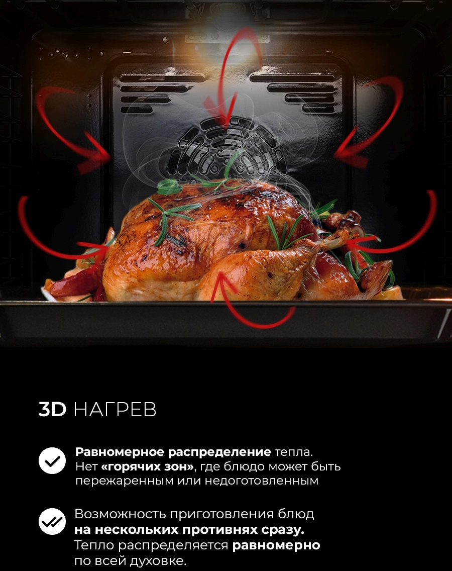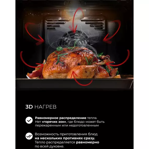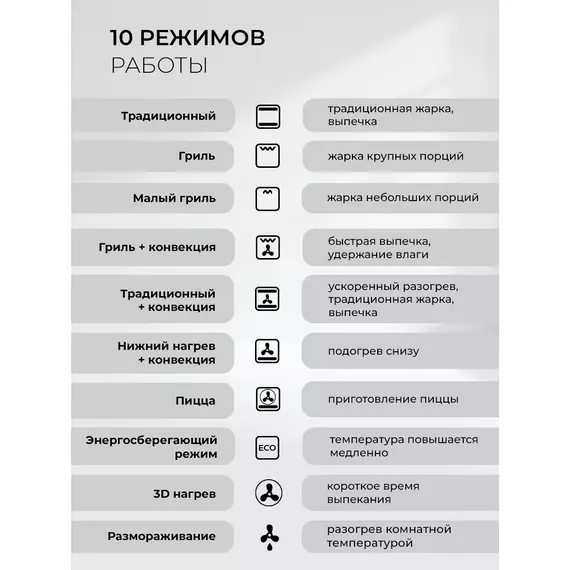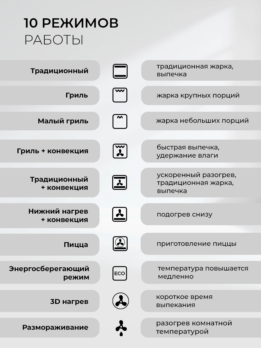 | Режимы духовки | 3D конвекция, Гриль с конвекцией, Нижний нагрев с конвекцией, Размораживание, Традиционный, Малый гриль, Пицца, Полный гриль, Традиционныи, нагрев + конвекция, Энергосберегающий режим |