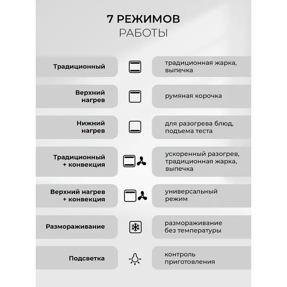 | Режимы духовки | Верхний нагрев, Верхний нагрев с конвекцией, Нижний нагрев, Подсветка, Размораживание, Традиционный, Традиционныи? нагрев + конвекция |
