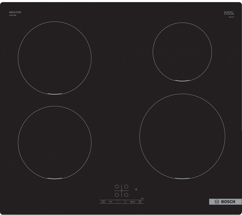 - Встраиваемая индукционная варочная панель BOSCH PUE611BB5E Series 4 имеет стандартную ширину 60 см и оборудована 4 зонами готовки