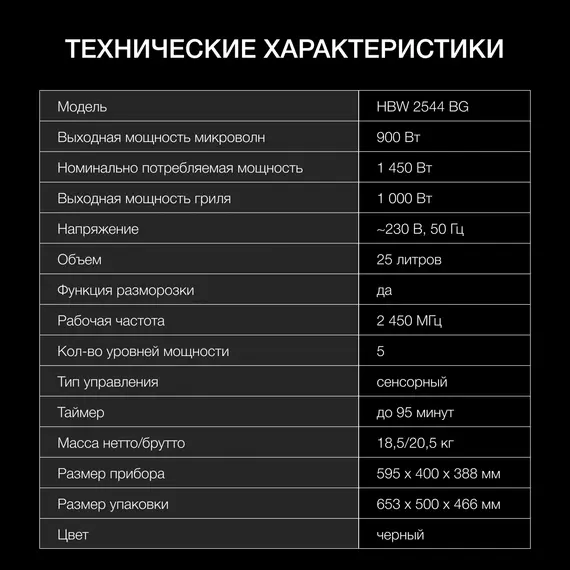 | Режимы | автоматическая разморозка, автоматический разогрев, автоматическое приготовление, гриль |