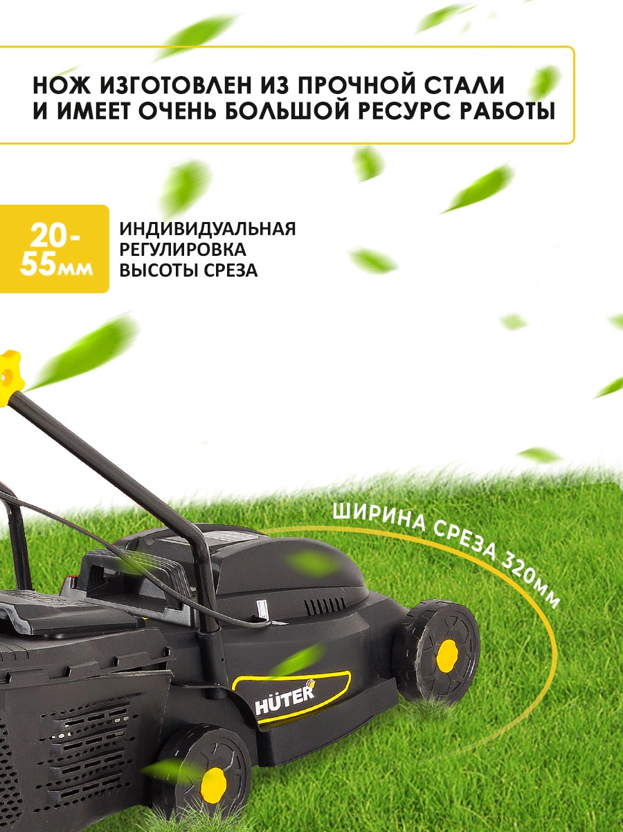 | Особенности | Корпус выполнен из прочного и лёгкого пластика. Надёжный электродвигатель. Широкий диапазон высоты среза. Вместительный травосборник. Нож изготовлен из прочной стали и имеет очень большой ресурс работы. |
