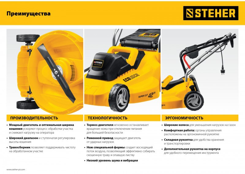 - Облегченные колеса и эргономичная рукоятка облегчают перемещение косилки по газону