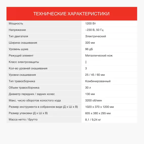 | Комплект поставки | Газонокосилка, травосборник, рукоятка, комплект крепежа |
