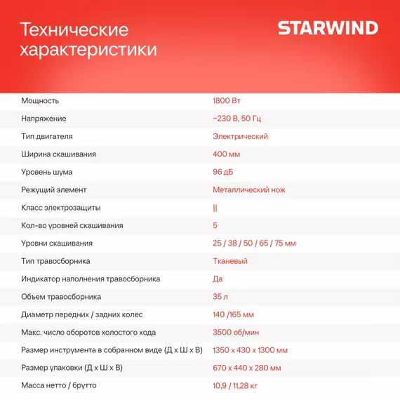 Газонокосилка роторная STARWIND ELM-1800 1800Вт