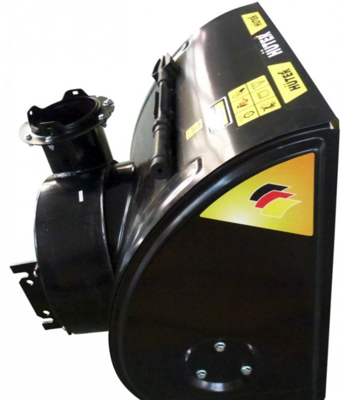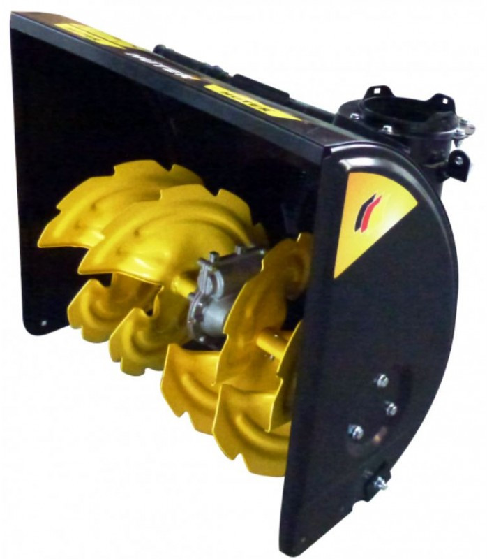 - Конструкция насадки состоит из снегоуборочного ковша с металлическим шнеком и желобом для выброса снега. На желобе есть ручка регулировки направления и высоты выброса снега