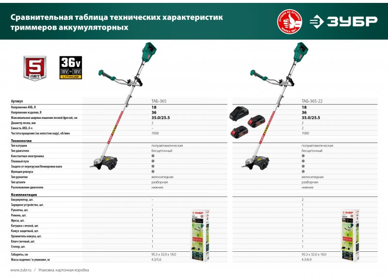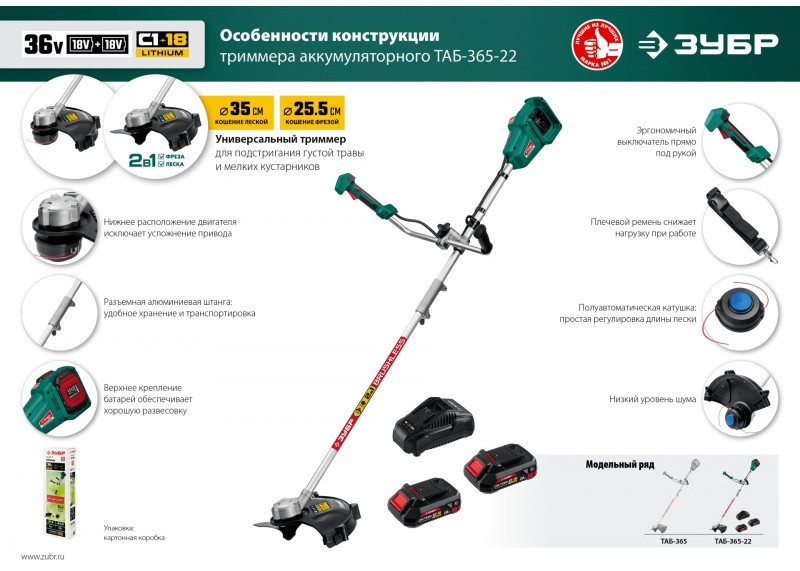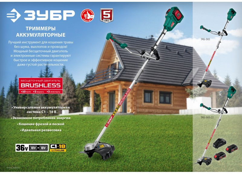 Бесщеточный триммер Зубр ТАБ-365-22 36В, 2х18В АКБ (2Ач)