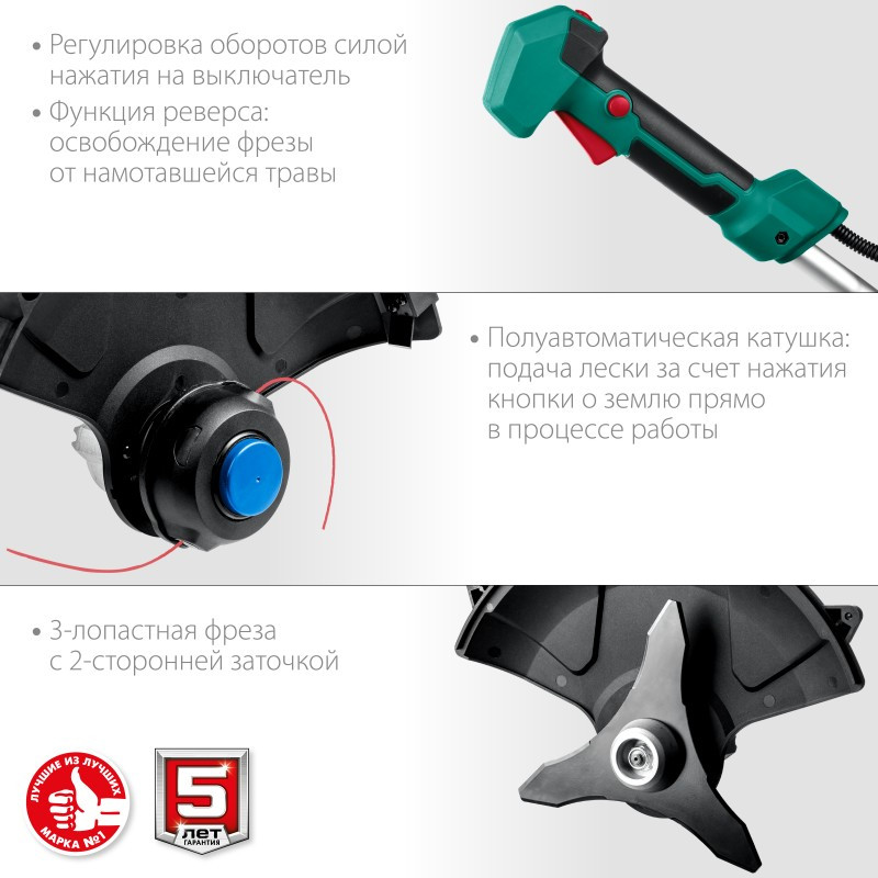 - благодаря току до 2.4А заряжает батарею за 1 час* - Возможность установки двух видов режущего инструмента - лески и ножа - делают изделие универсальным