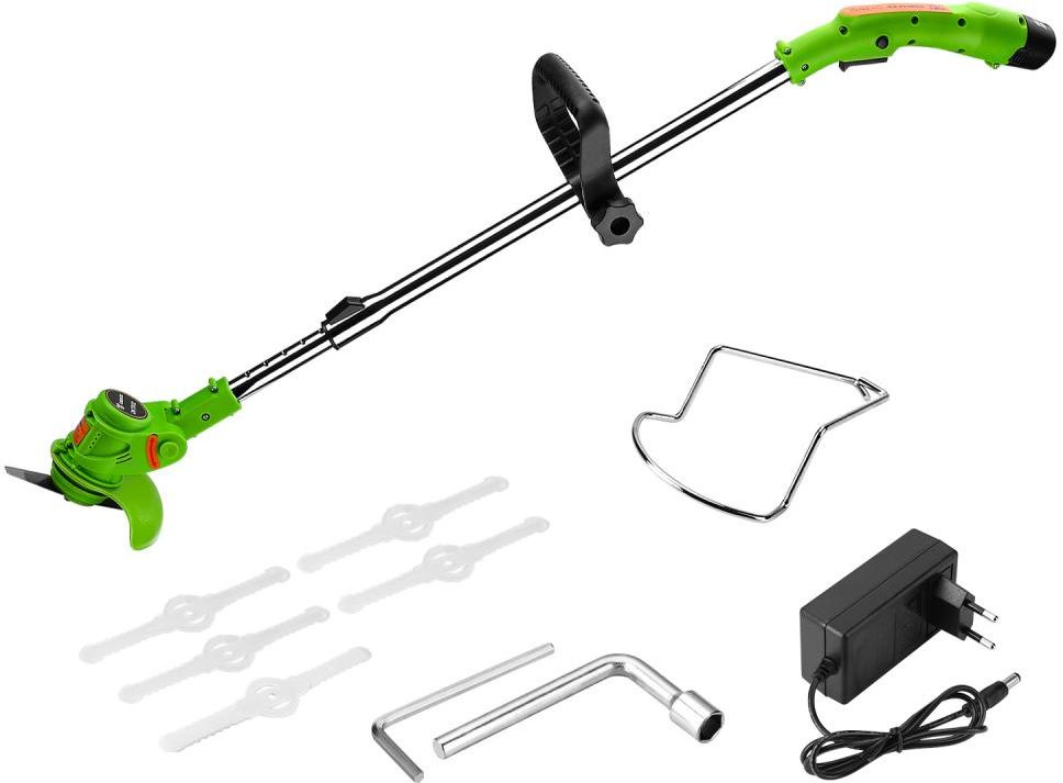 | Комплект поставки | триммер, аккумуляторная батарея, зарядное устройство, пластиковые лезвия - 5 шт., металлическое лезвие, шестигранный ключ, торцевой ключ с внутренним шестигранником, рукоятка, скоба. |
