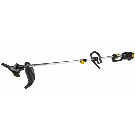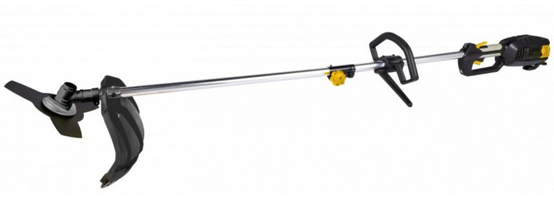 - Из отличительных особенностей модели стоит выделить разборную штангу, которая облегчает транспортировку и хранение инструмента. Также в комплект входит 3-х лопастной нож, позволяющий скашивать густую поросль