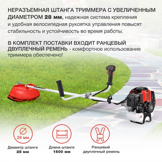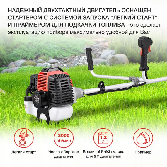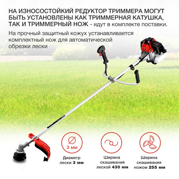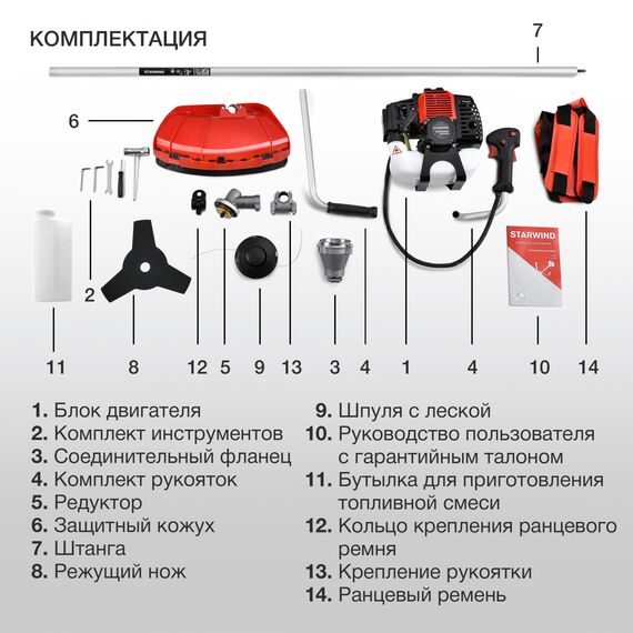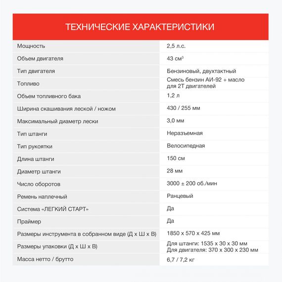 | Комплект поставки | Блок двигателя,Штанга,Комплект крепежа,Комплект рукояток,Ранцевый ремень,Защитный кожух,Бутылка,Нож,Шпуля с леской |