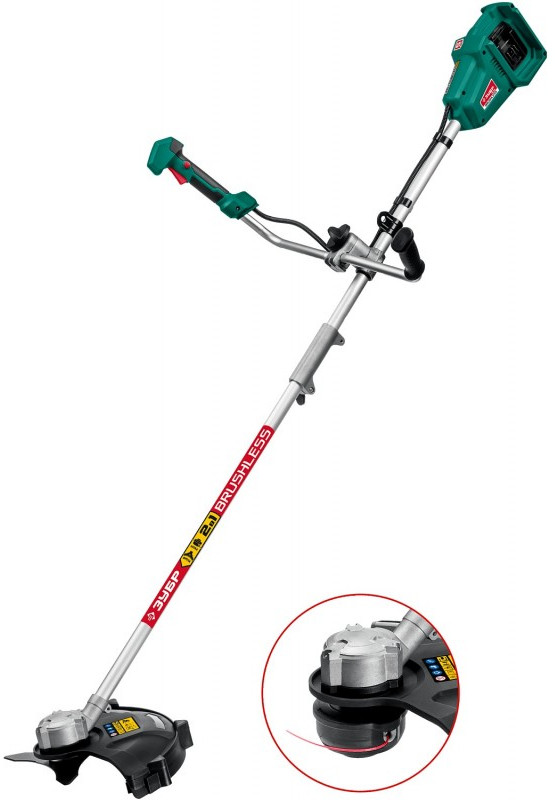 - Универсальный инструмент на участке, способный заменить газонокосилку и триммер. Оснащается катушкой с леской (для мягкой растительности) и ножом (для грубой растительности). Большая мощность двигателя BRUSHLESS и две батареи позволяют косить довольно густую и грубую растительность длительное время