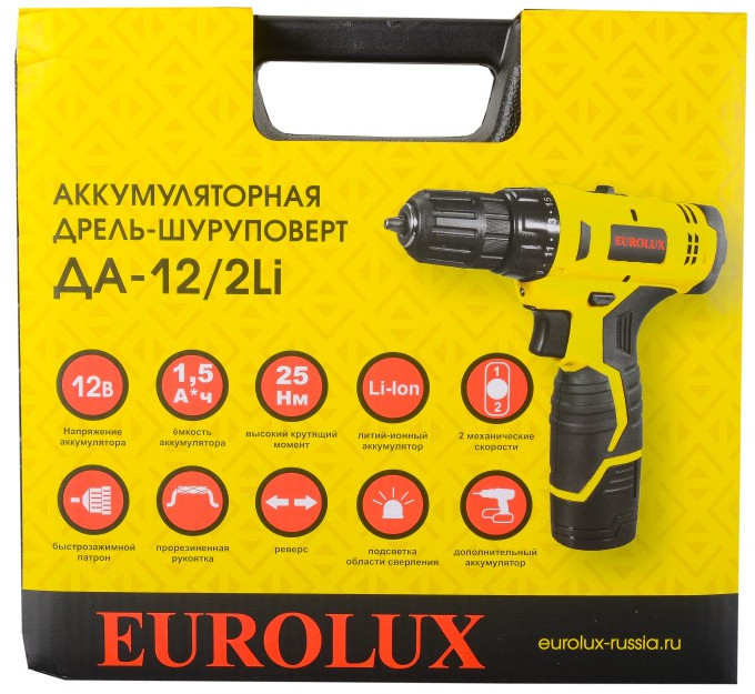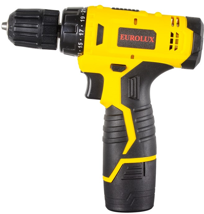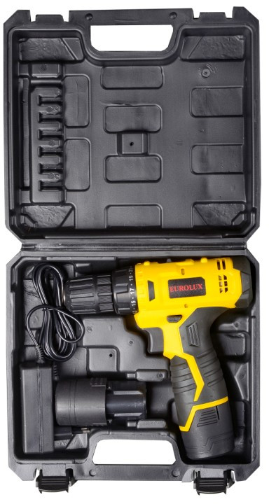 Аккумуляторная дрель-шуруповерт Eurolux ДА-12/2Li – ручной электроинструмент с регулируемым крутящим моментом, предназначенный для закручивания и откручивания шурупов, саморезов, винтов и других видов крепежных изделий, а также сверления отверстий в различных конструкционных материалах