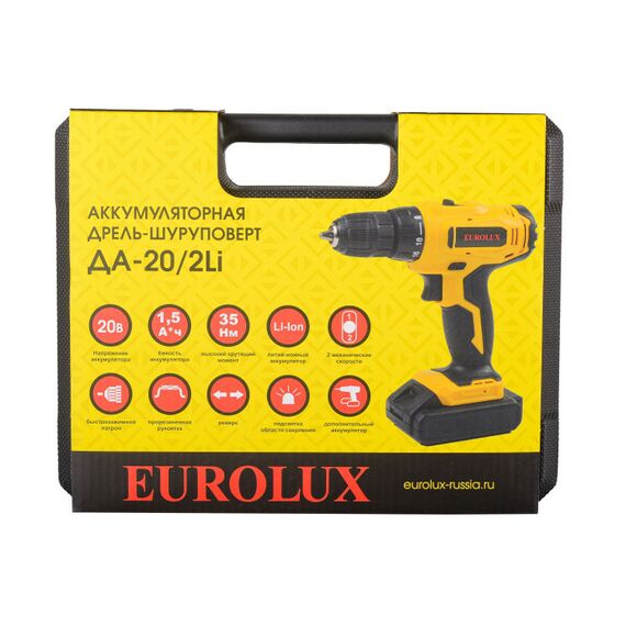 Дрель-шуруповерт аккумуляторная Eurolux ДА-20/2Li безударный, быстрозажимной, 0-400, 0-1400 об/мин, 35/18 Нм, 20В, 1.5 А*ч, 1.3 кг, кейс