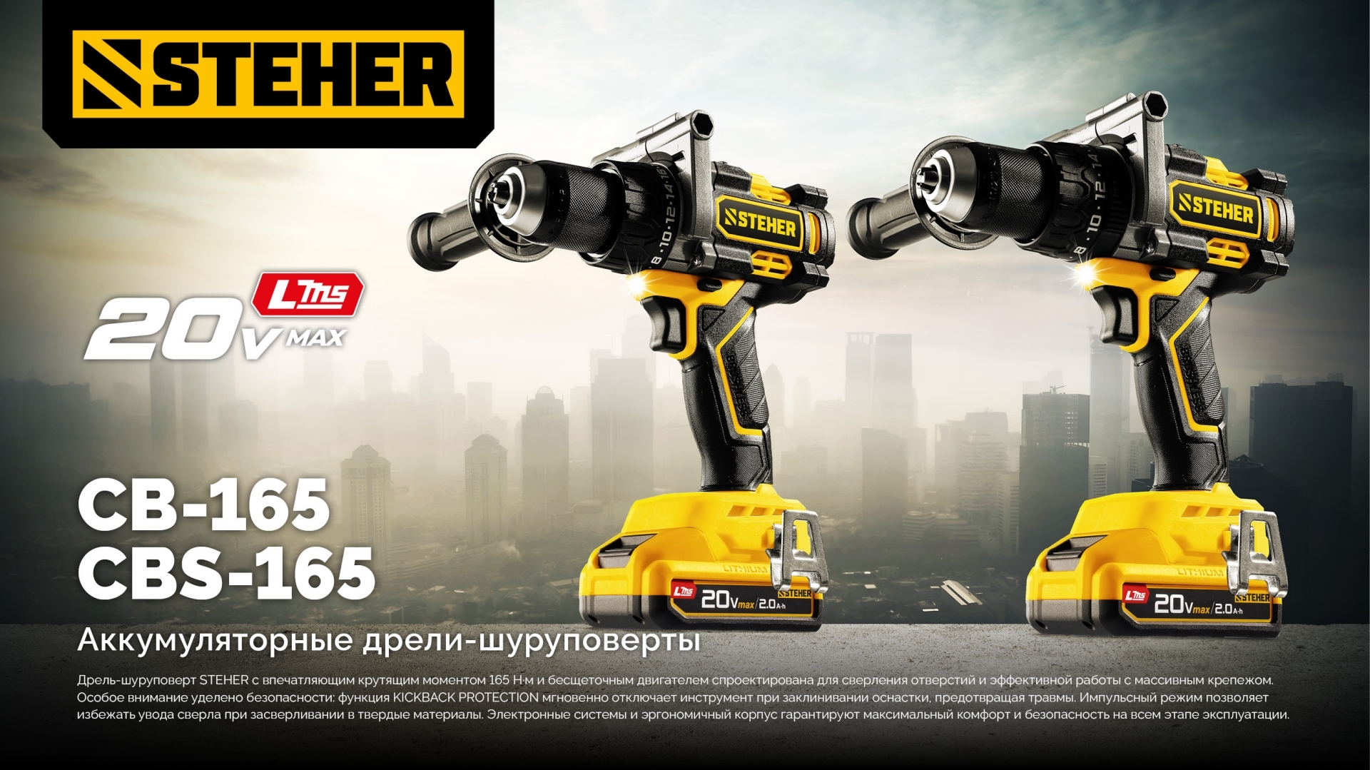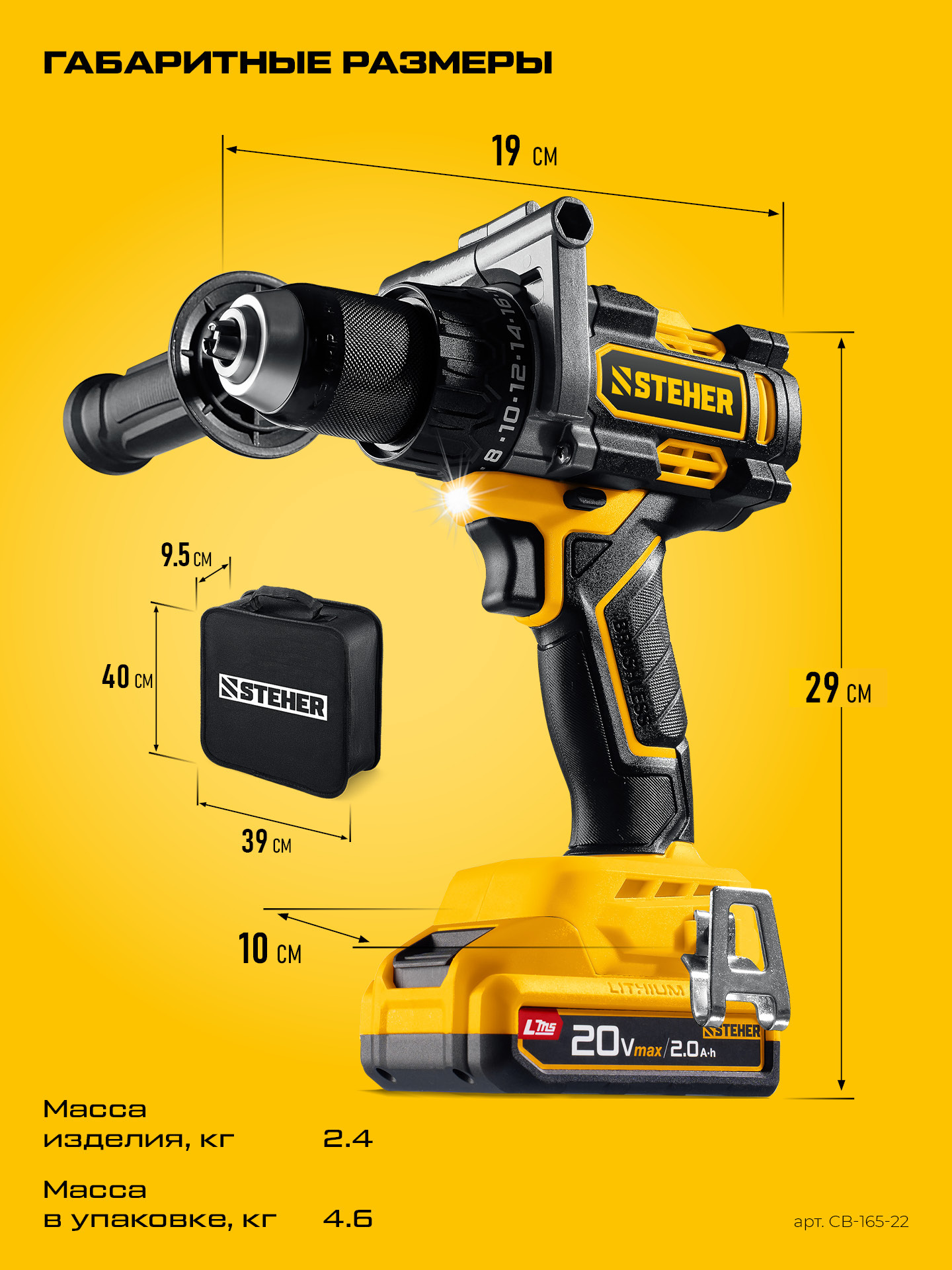 Бесщеточная дрель-шуруповерт STEHER CB-165-22 20 В, 165 Н·м, 2 АКБ LMS (2 А·ч), сумка