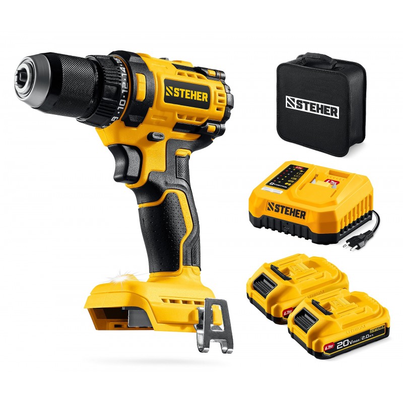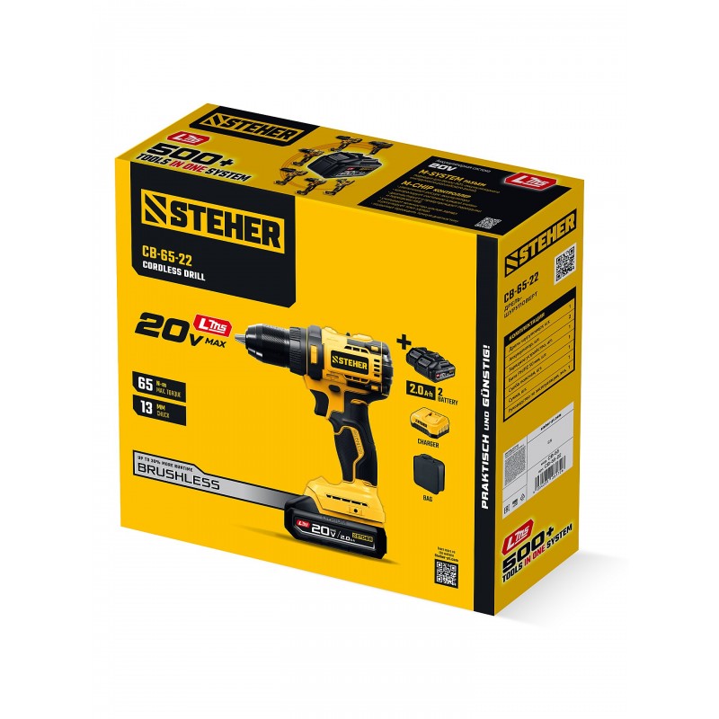 Бесщеточная дрель-шуруповерт STEHER CB-65-22 20 В, 65 Н·м, 2 АКБ LMS (2 А·ч), сумка