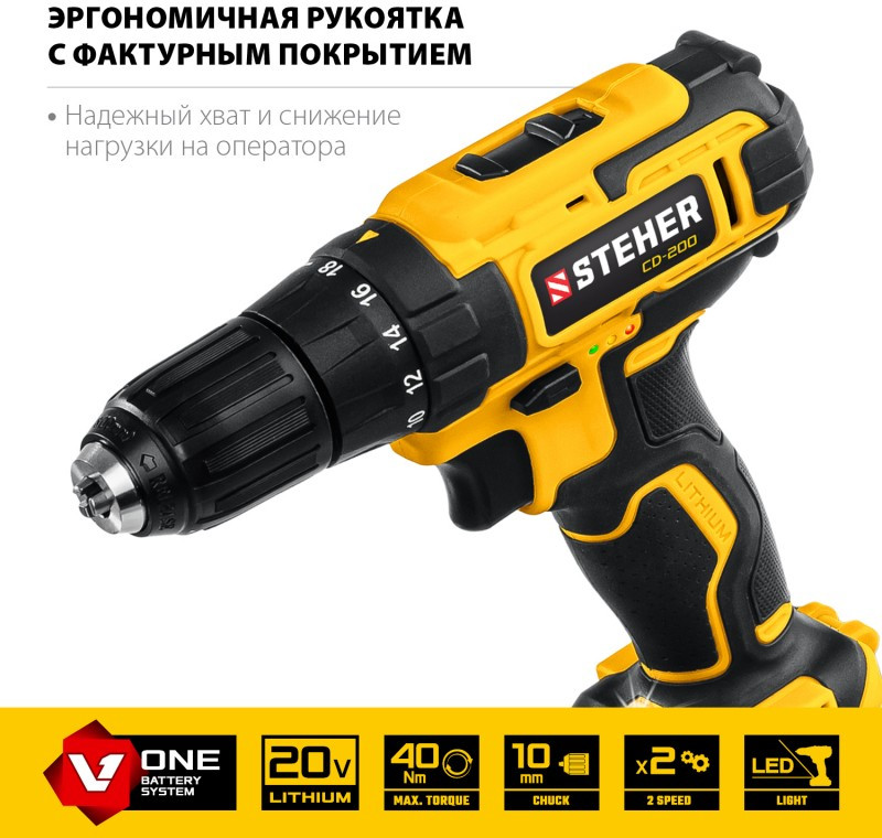 Дрель-шуруповерт STEHER CD-200 20В, без АКБ, в коробке