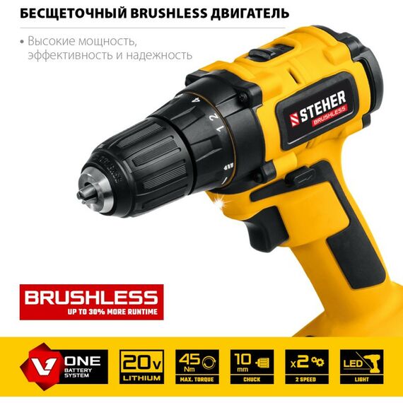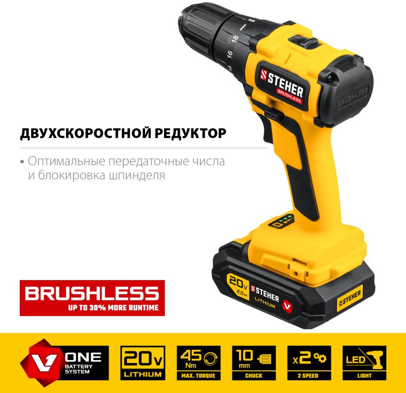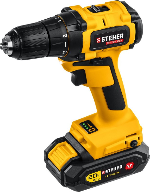 Дрель-шуруповерт STEHER CDB-200-1 20В, бесщёточная, 1 АКБ (2Ач), в кейсе