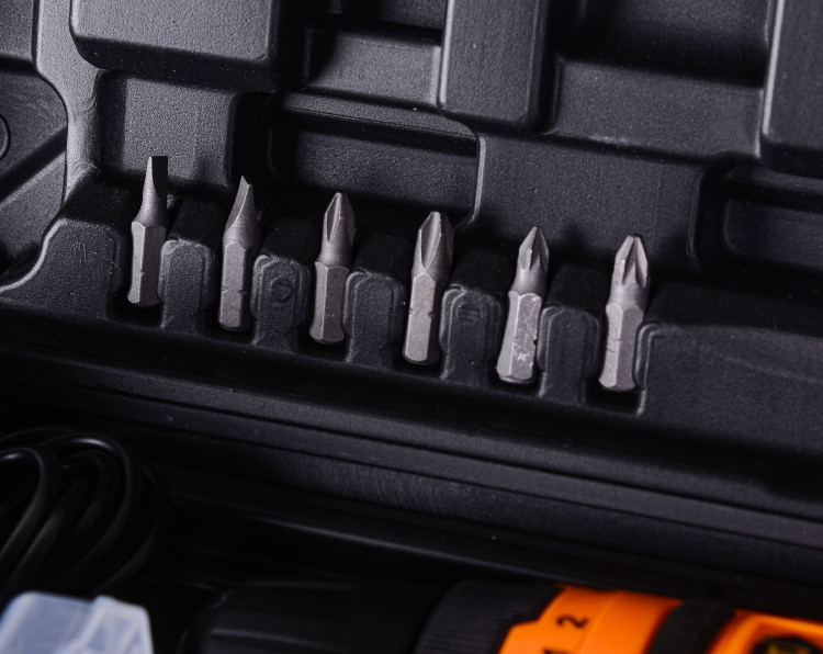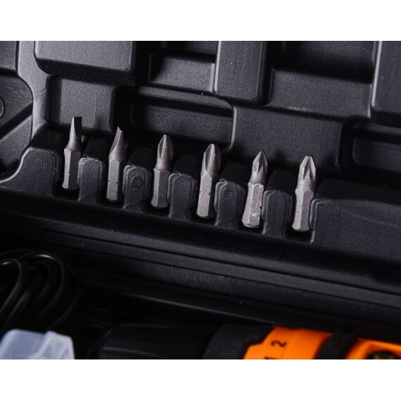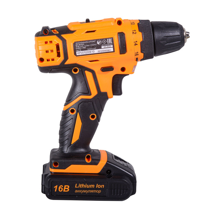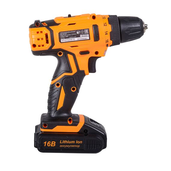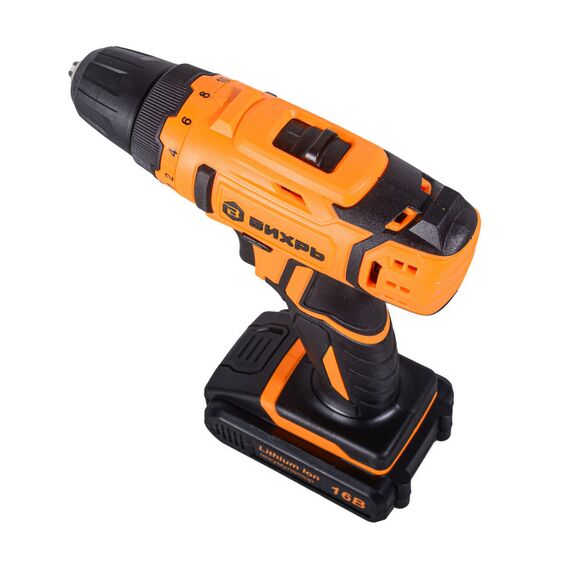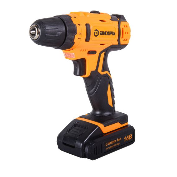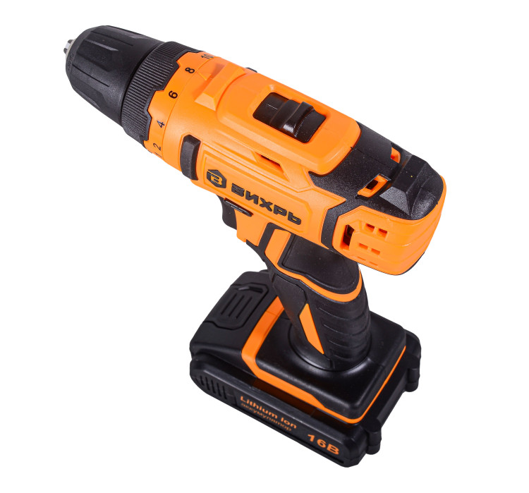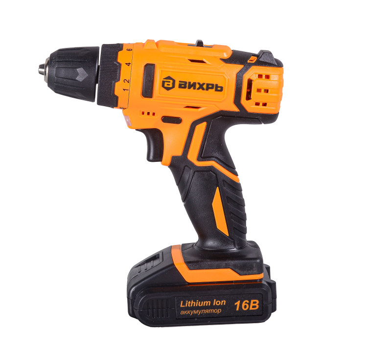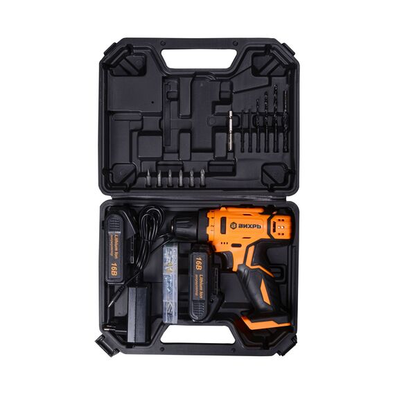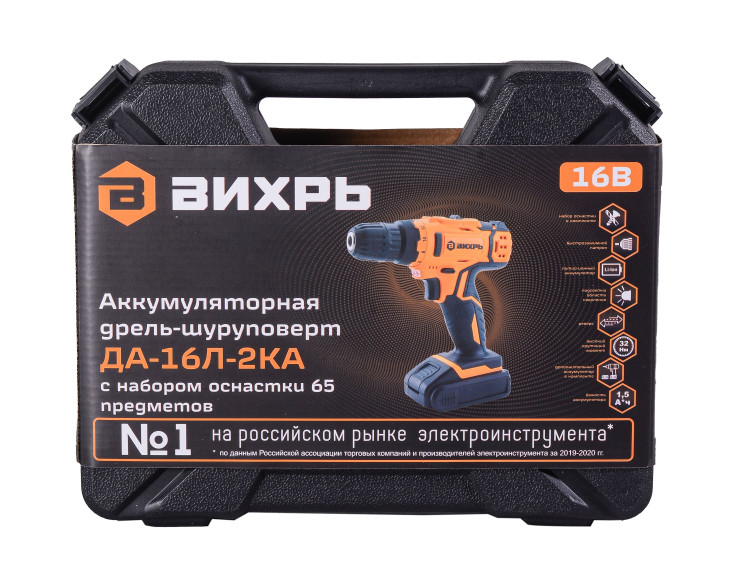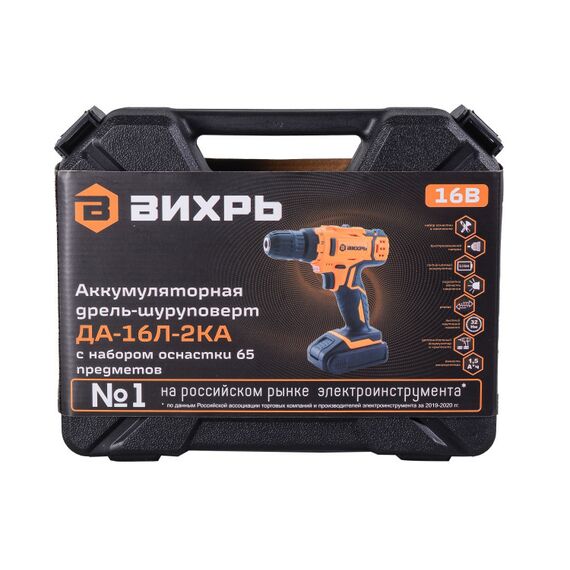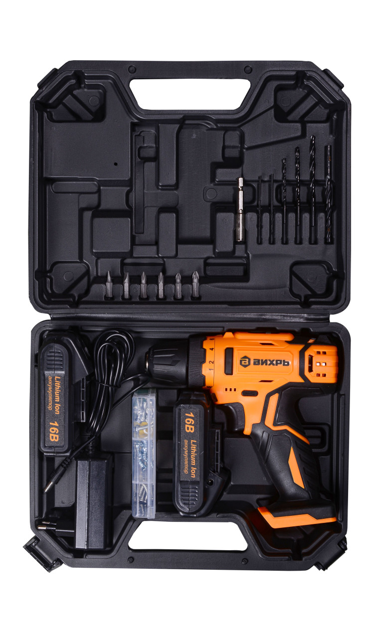 Дрель-шуруповерт аккумуляторная Вихрь ДА-16Л-2КА безударный, быстрозажимной, 400/1400 об/мин, 32/15 Нм, 16 В, 1.5 А*ч, 2.3 кг, кейс, с набором оснастки 65 предметов