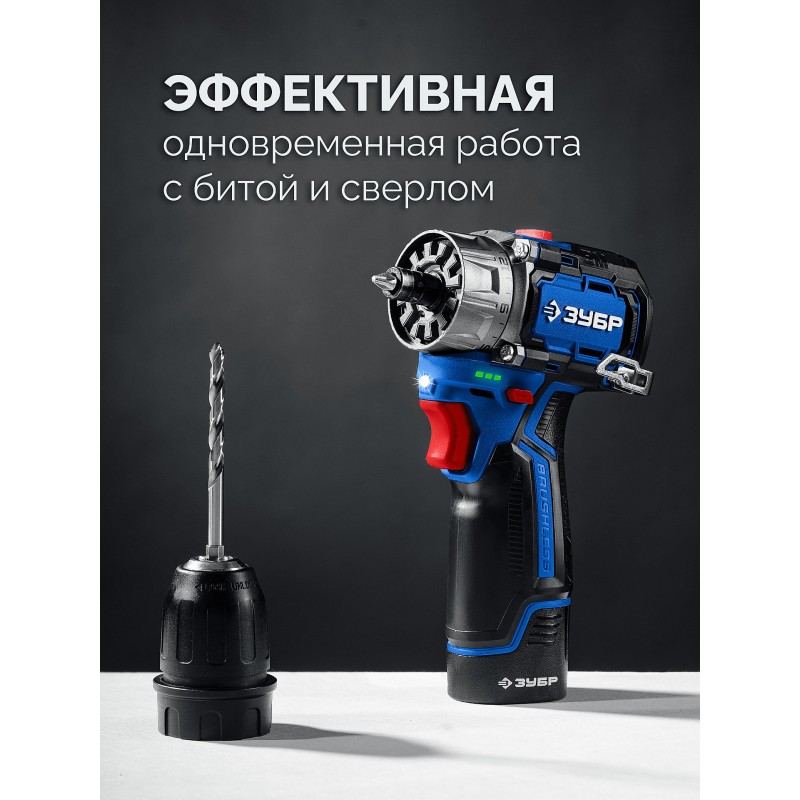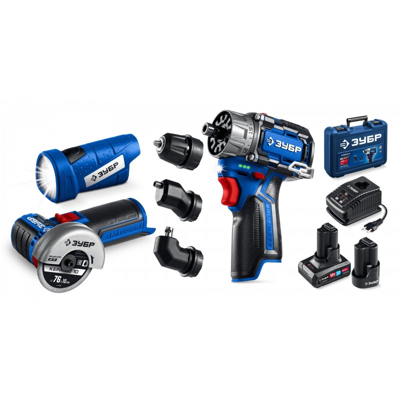 Набор: дрель-шуруповерт + мини УШМ + LED фонарь Зубр DB-125-42ABF КОМБИ #5, BRUSHLESS, 12 В, 45 Н·м, 2 АКБ тип Т7 (4 и 2 А·ч), кейс, Профессионал