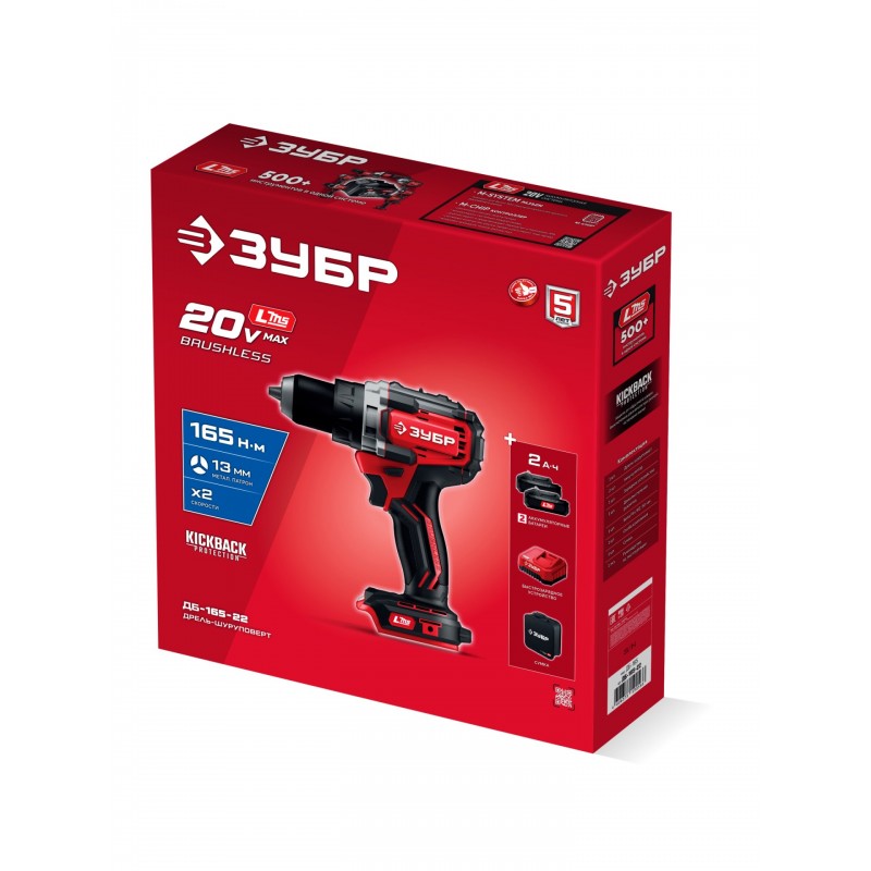 Бесщеточная дрель-шуруповерт Зубр ДБ-165-22 20 В, 165 Н·м, 2 АКБ LMS (2 А·ч), сумка