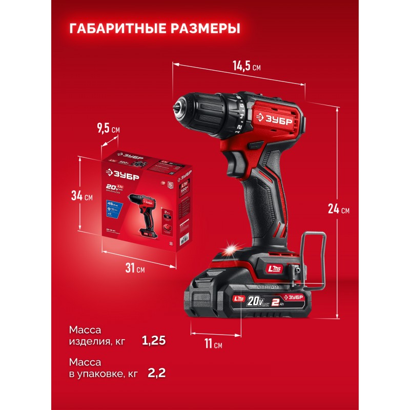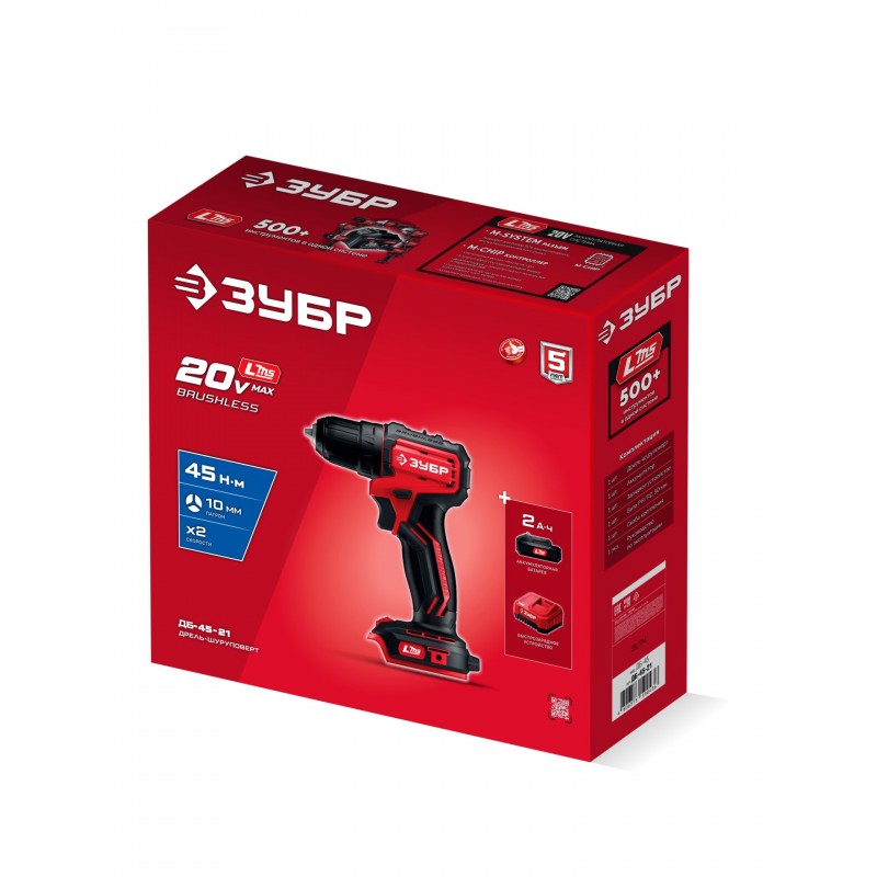 Бесщеточная дрель-шуруповерт Зубр ДБ-45-21 ЗУБР 20 В, 45 Н·м, 1 АКБ LMS (2 А·ч)