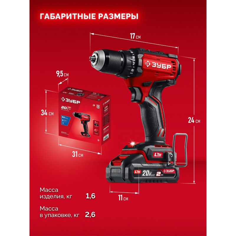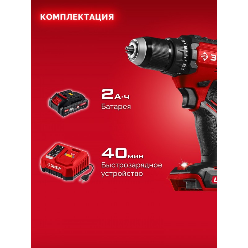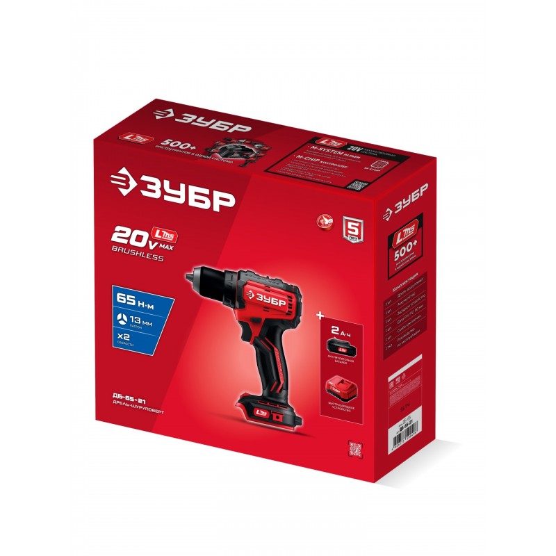 Бесщеточная дрель-шуруповерт Зубр ДБ-65-21 20 В, 65 Н·м, 1 АКБ LMS (2 А·ч)