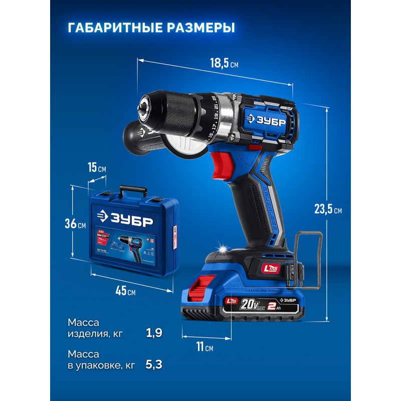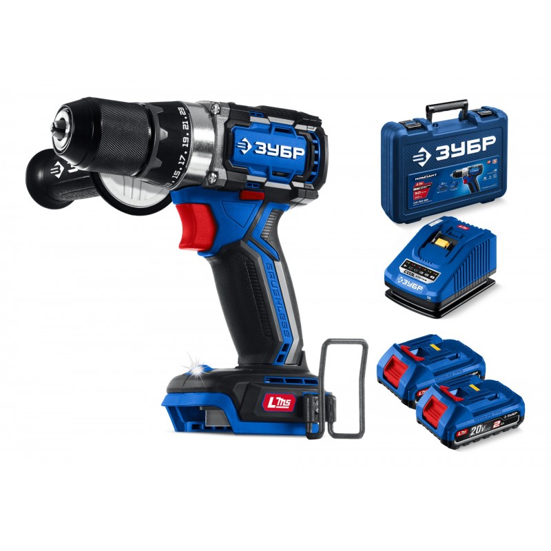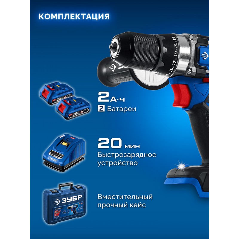 Бесщеточная дрель-шуруповерт Зубр DB-70-22 20 В, 70 Н·м, 2 АКБ LMS (2 А·ч), кейс, ПРОФЕССИОНАЛ