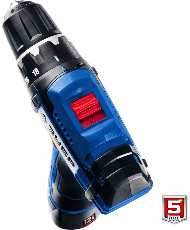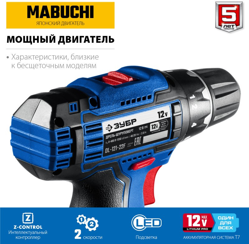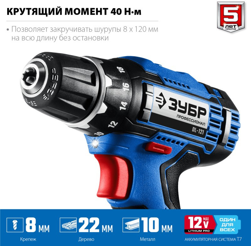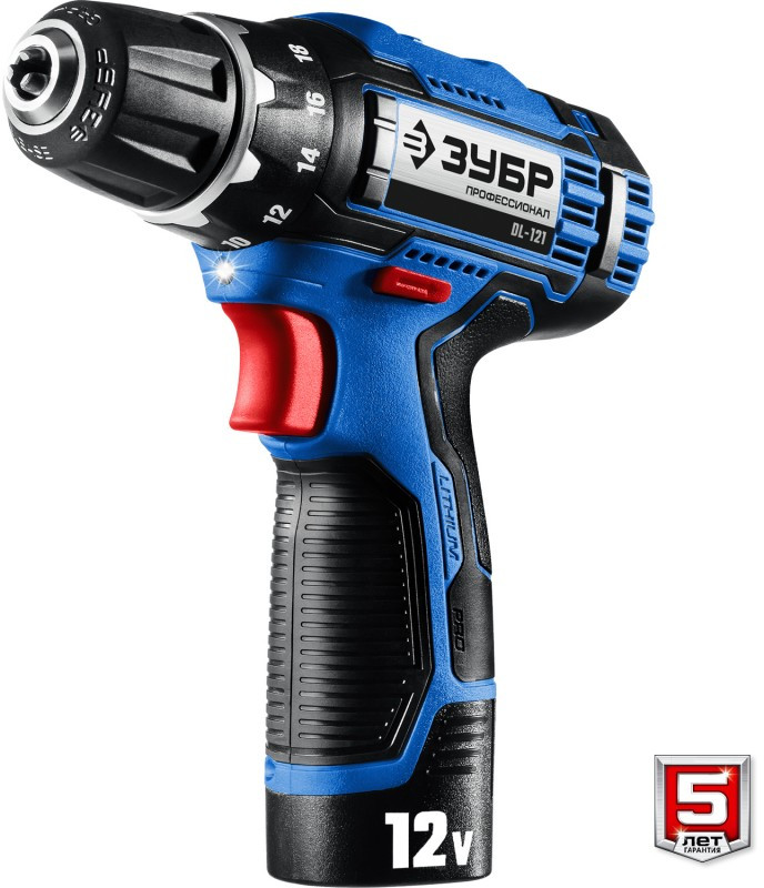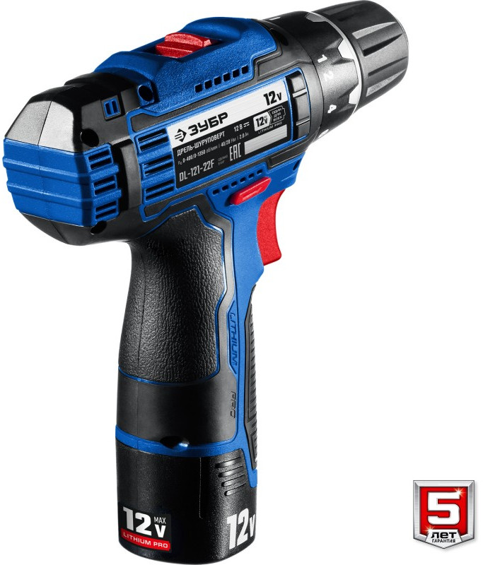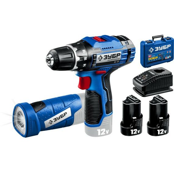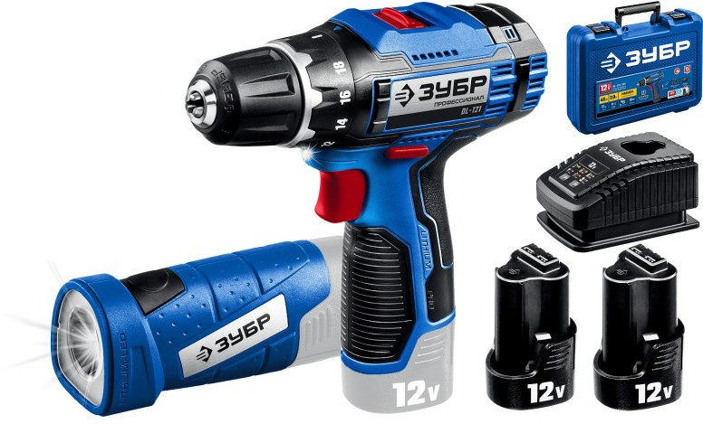 Дрель-шуруповерт Зубр DL-121-22F Профессионал 12В + LED фонарь, 2 АКБ (2Ач), в кейсе