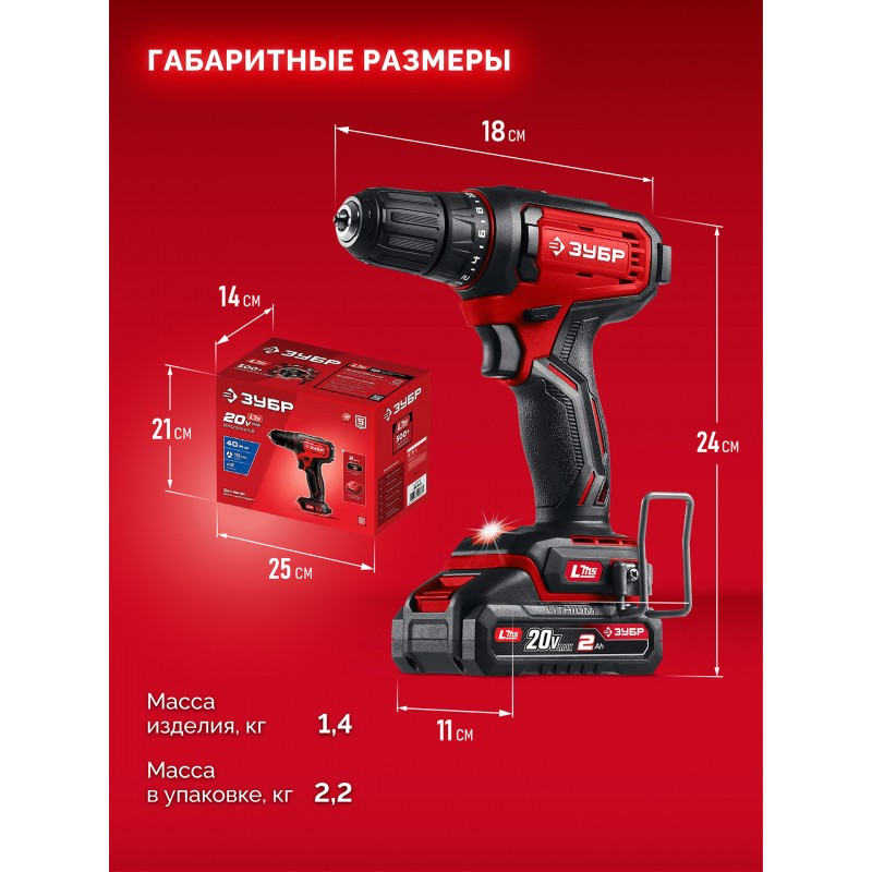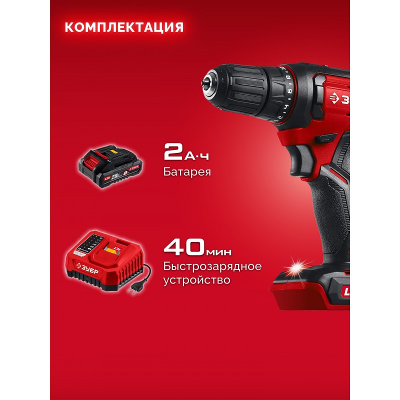 Дрель-шуруповерт Зубр ДШ-40-21 20 В, 40 Н·м, 1 АКБ LMS (2 А·ч)