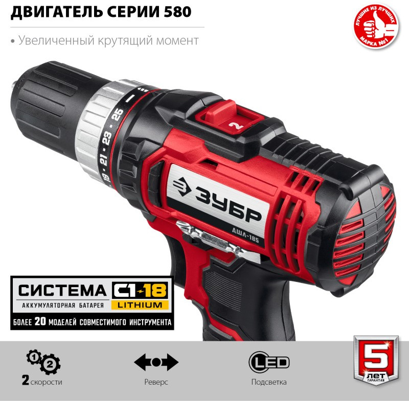 Дрель-шуруповерт Зубр ДШЛ-185-22 18В, 2 АКБ (2Ач), в кейсе