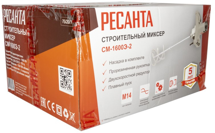 Строительный миксер Ресанта СМ-1600Э-2 - электрический инструмент, предназначенный для перемешивания различных компонентов (сухой смеси, жидкости) при получении различных строительных и отделочных материалов (бетон, штукатурка, различные клеевые смеси, краска и т.д.)
