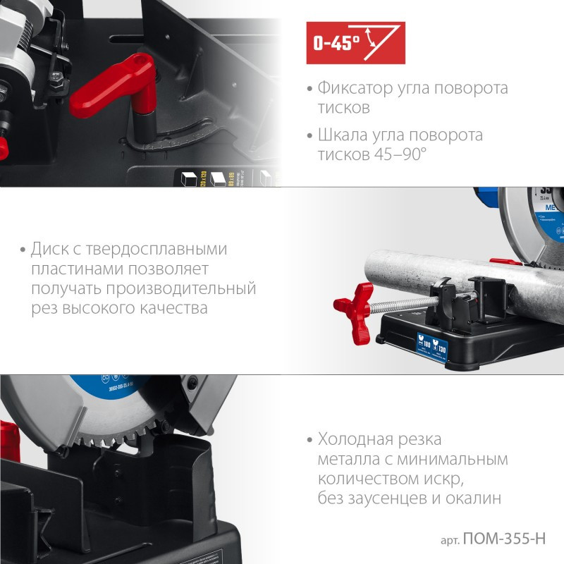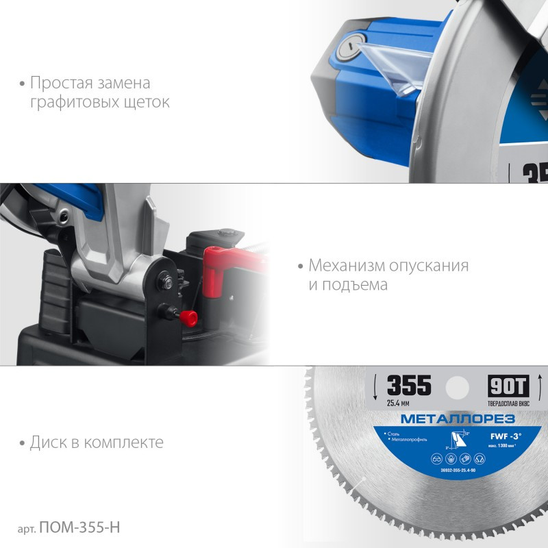 ПОМ-355-Н Профессиональная отрезная пила для пильных дисков по металлу. Диск с твердосплавными пластинами (в комплекте) позволяет получить стабильный производительный рез высокого качества, с минимальным количеством искр, без заусенцев и окалин.