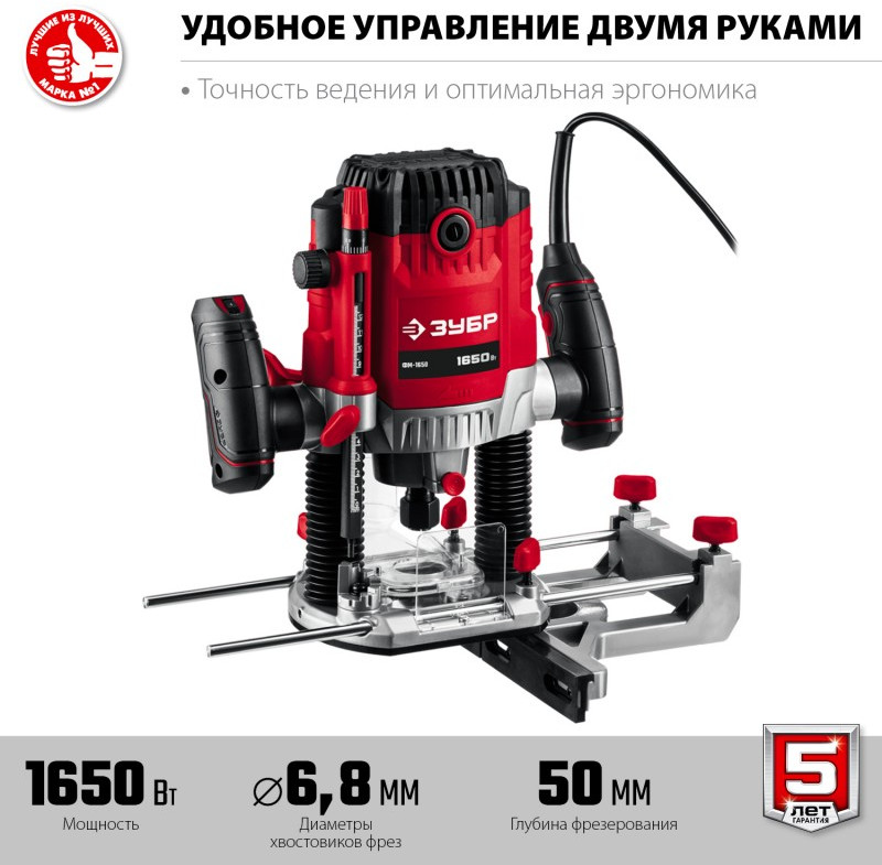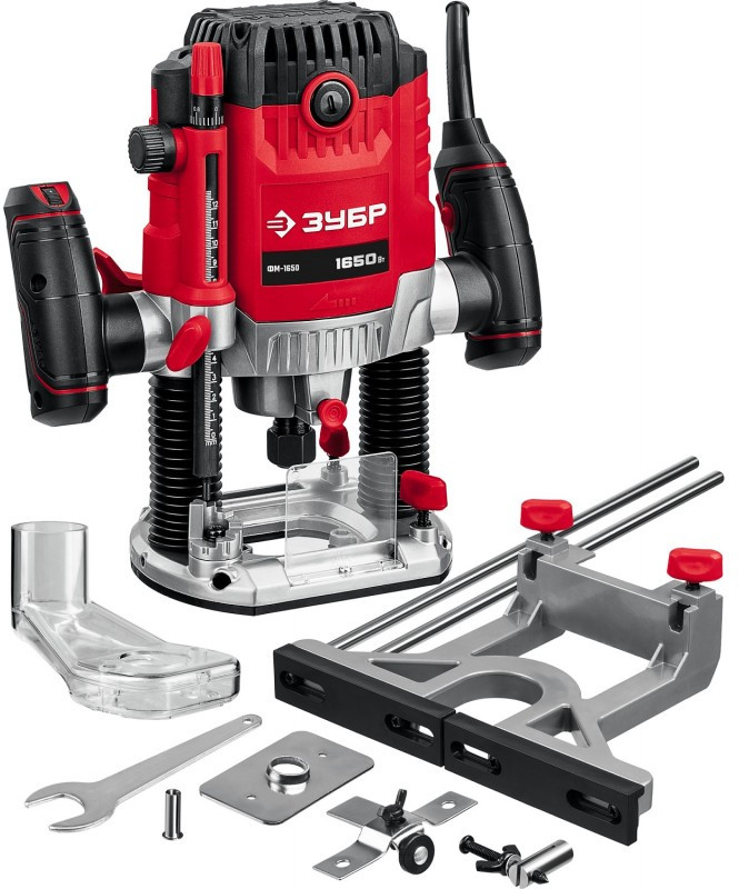 - Фрезер ЗУБР – многофункциональное изделие для различных видов фрезерования (в т.ч. фигурного, по шаблону, по радиусу). Достаточная мощность и большая глубина фрезерования (50 мм), точная настройка глубины обработки, два вида цанг для установки различных фрез, точный выбор оборотов, полный комплект принадлежностей для начала работа