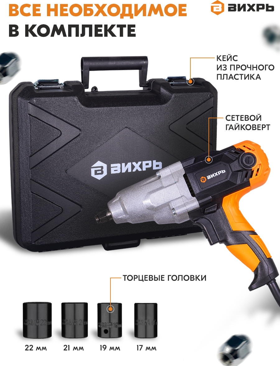 | Комплект поставки | Жесткий кейс в комплекте; так как в основном гайковёрт применяется при шиномонтаже, то вся необходимая оснастка имеется сразу в комплекте (4 самые популярные торцевые головки) |