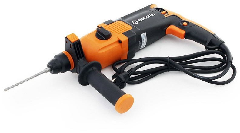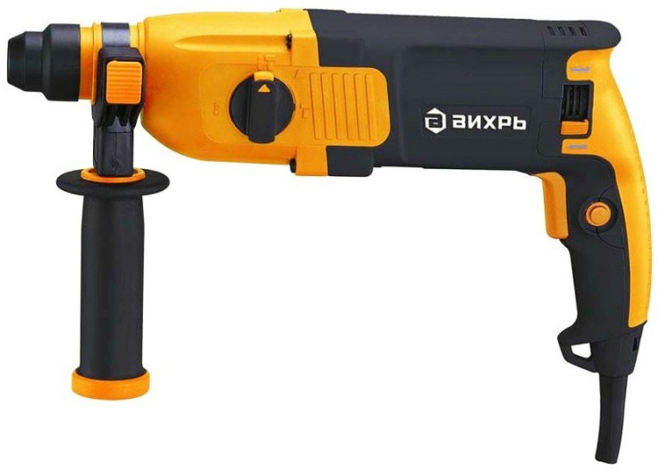 - Перфоратор ВИХРЬ – электроинструмент, аналогичный дрели, но с наличием не механического, а пневматического ударного механизма. Именно поэтому перфоратор используют для сложных работ по твёрдым материалам - бетону, кирпичу, металлам. Агрегат используется для сверления и пробивания отверстий в прочных материалах без приложения особых физических усилий со стороны оператора. Принцип работы перфоратора – это разрушение обрабатываемого материала с помощью поступательных и вращательных действий рабочего элемента. Состоит перфоратор из электрического двигателя, редуктора, ударного механизма и патрона для крепления рабочих инструментов (буры, коронки, зубила и т.д.)