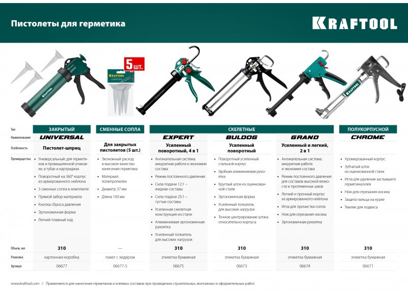 Пистолет для герметиков подходит для работы с картриджами объемом 310 мл, имеет усиленную скелетную конструкцию из стали, ручку из алюминиевого сплава, которые способствуют равномерной подачи клея либо герметика. Данная спецификация обеспечивает прочность и надежность конструкции пистолета при использовании.