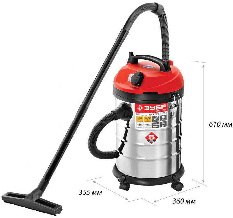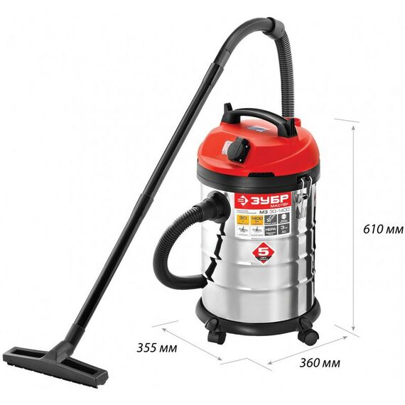 Пылесос строительный Зубр ПУ-30-1400 М3 модель М3-30, 30 л, 1400 Вт, сухая и влажная уборка, корпус из нержавеющей стали, розетка до 2000Вт