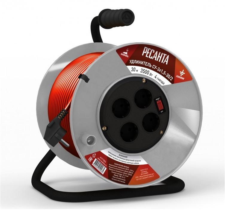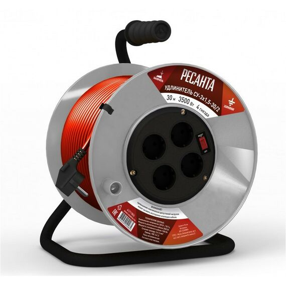 Удлинитель силовой на катушке РЕСАНТА СУ-3х1.5-30/2 30 м, ПВС, 3х1,5, 4 гнезда, пластиковая катушка, выключатель с тепловым реле [61/118/6]