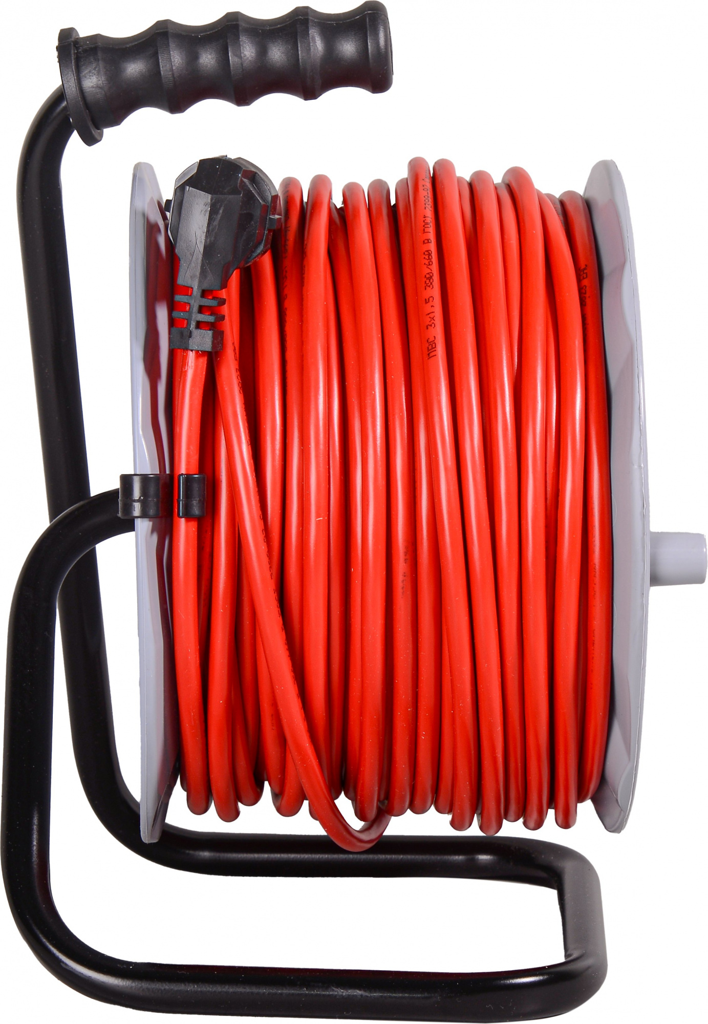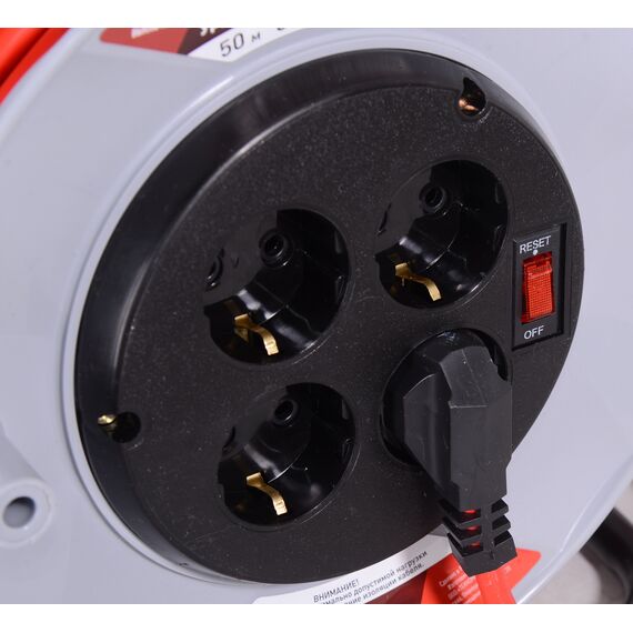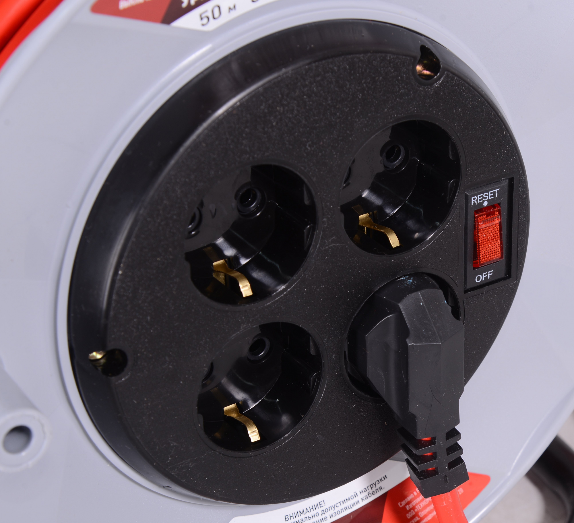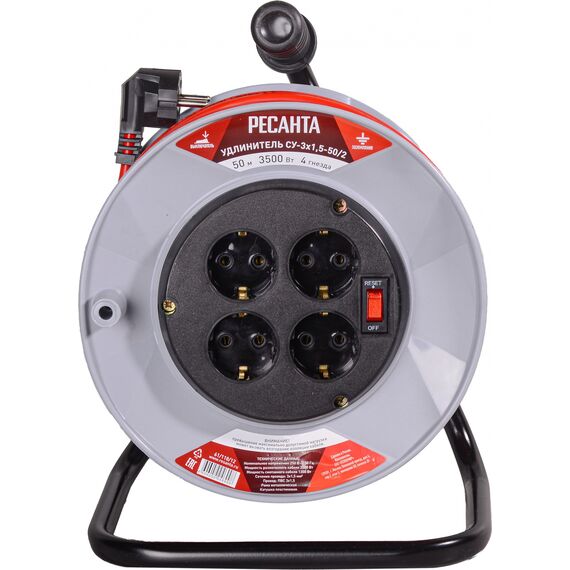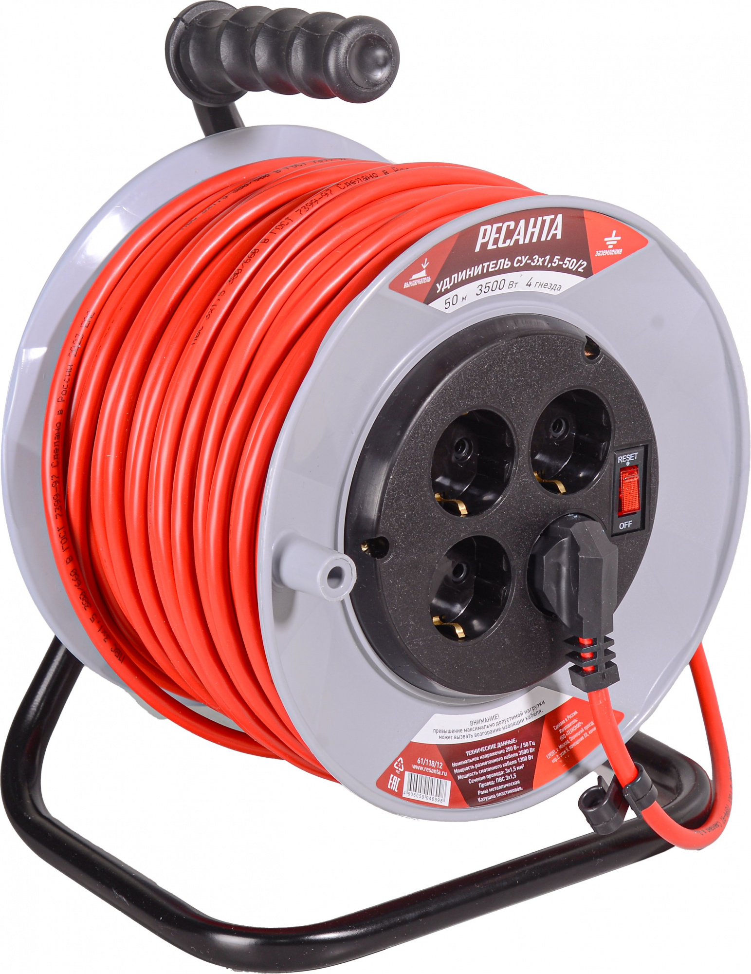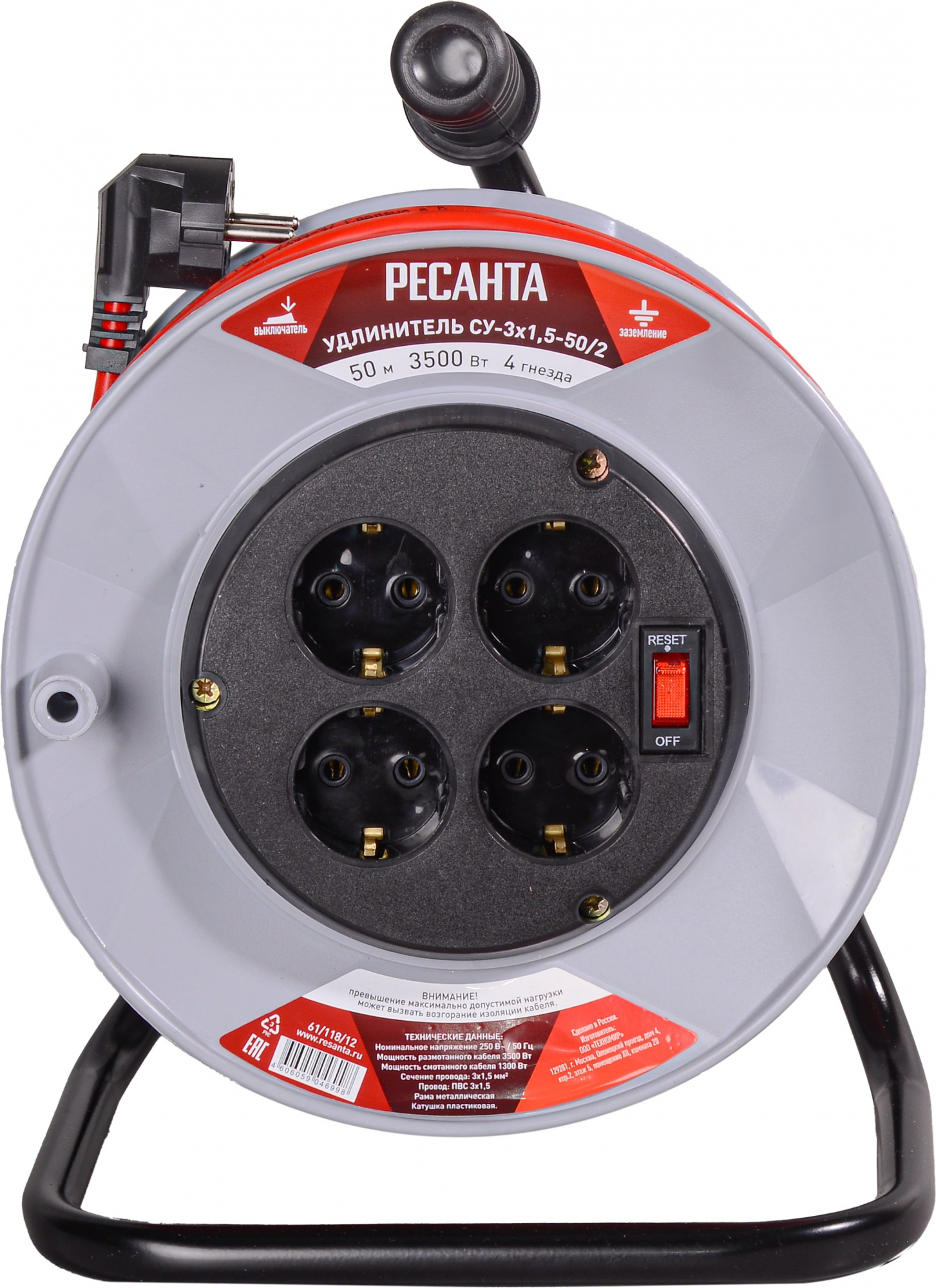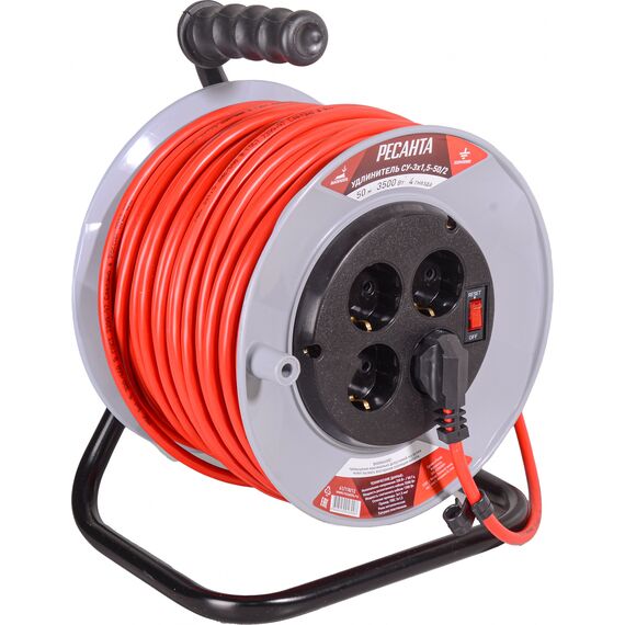 Удлинитель силовой на катушке РЕСАНТА СУ-3х1,5-50/2 50 м, ПВС, 3х1,5, до 3500 Вт, 4 гнезда, пластиковая катушка, выключатель с тепловым реле