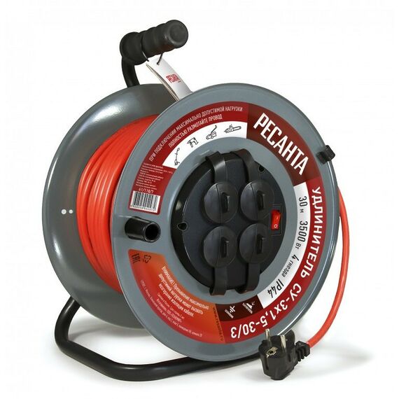 Удлинитель силовой на металлической катушке РЕСАНТА СУ-3х1.5-50/3 50 м, ПВС, 3х1.5, 4 гнезда, металлическая катушка, выключатель с тепловым реле [61/118/8]